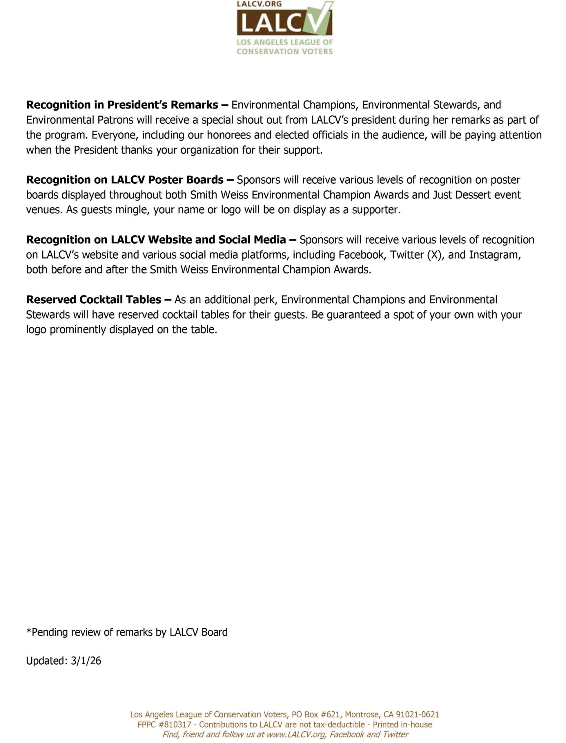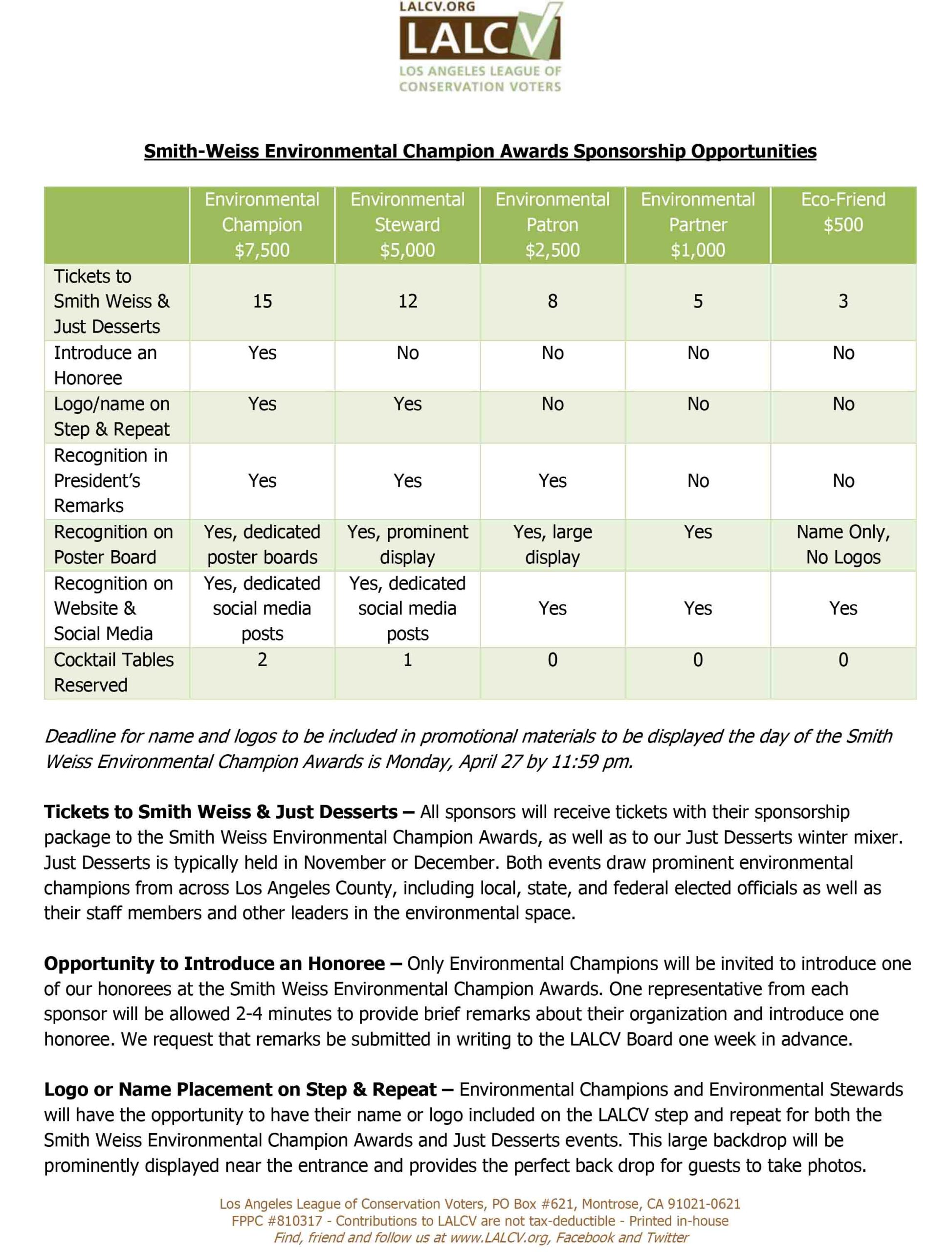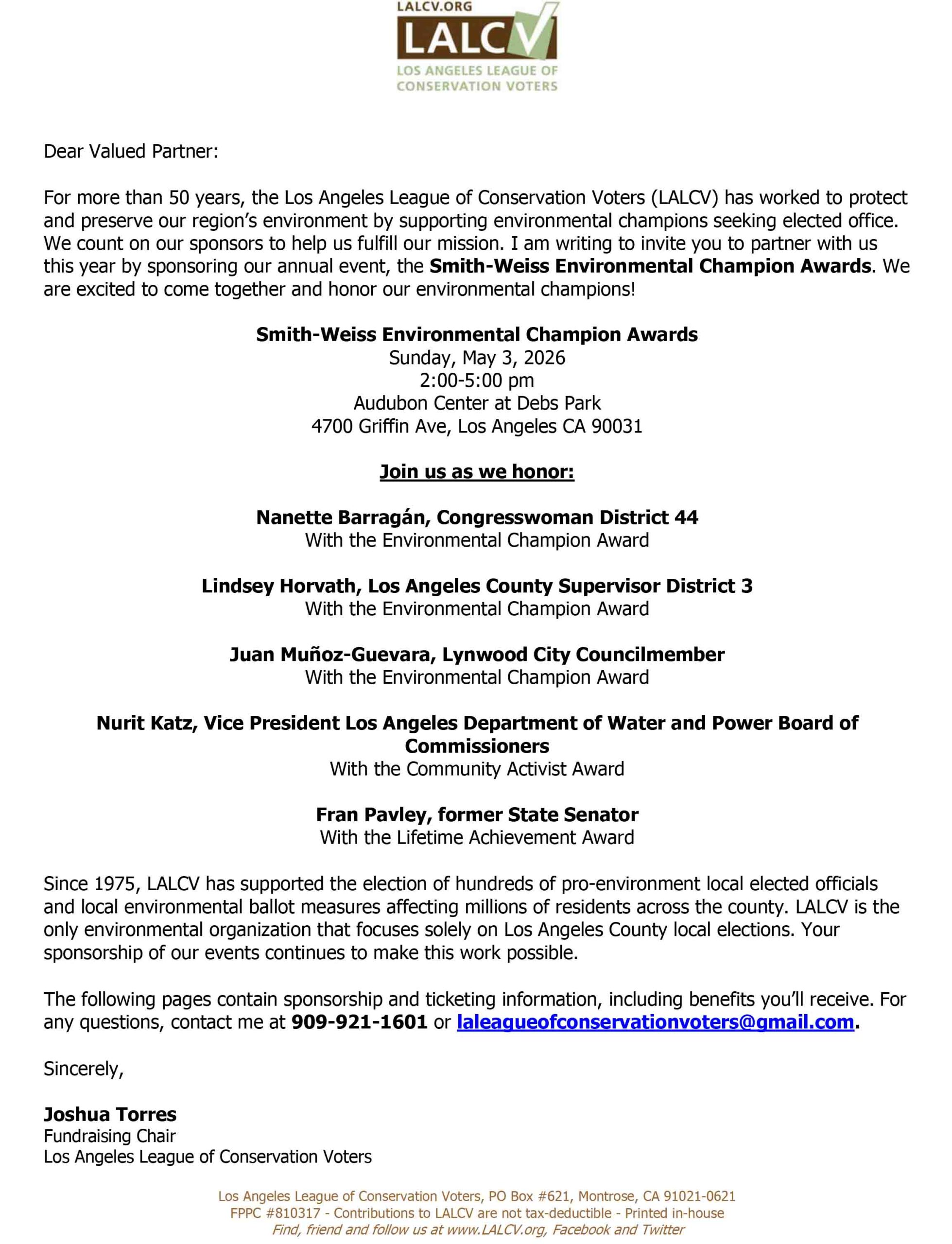 For more than 50 years, the Los Angeles League of Conservation Voters {LALCV) has worked to protect and preserve our region’s environment by supporting environmental champions seeking elected office. We count on our sponsors to help us fulfill our mission. We invite you to partner with us this year by sponsoring our annual event, the Smith-Weiss Environmental Champion Awards.